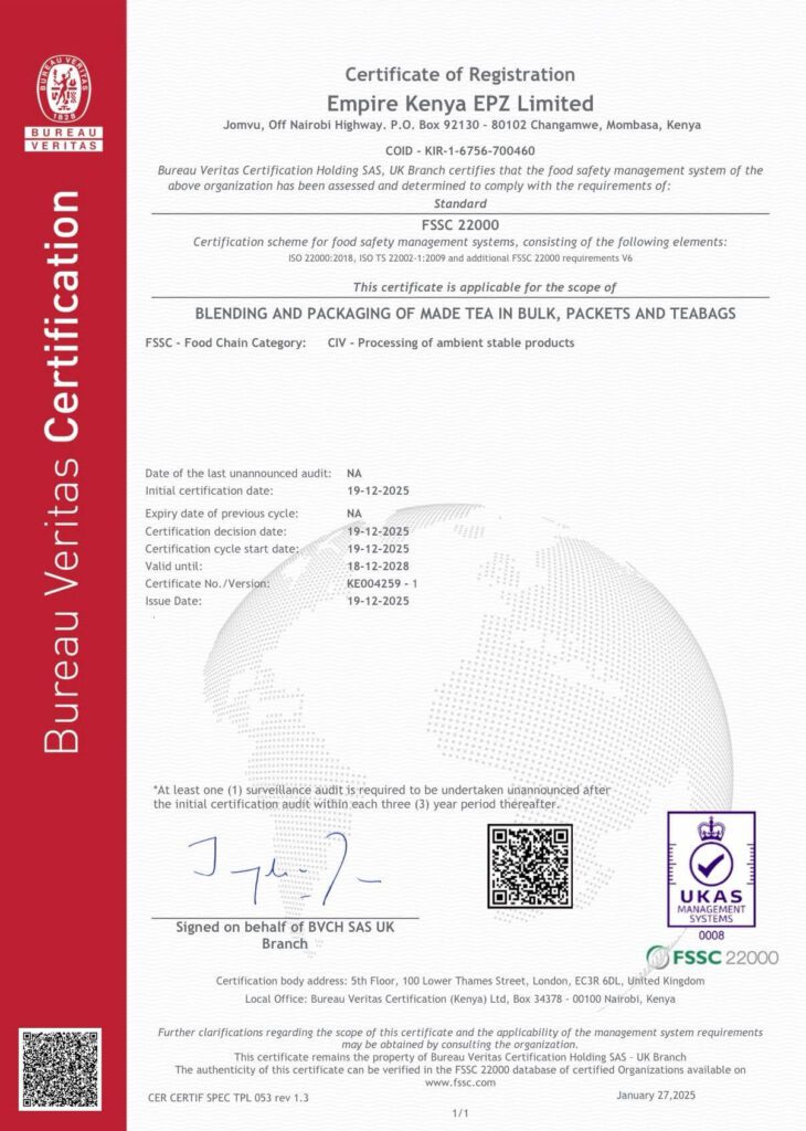 This milestone places us among the very few tea export companies in Kenya to achieve this prestigious certification, reinforcing our commitment to food safety, quality assurance, and international best practices.